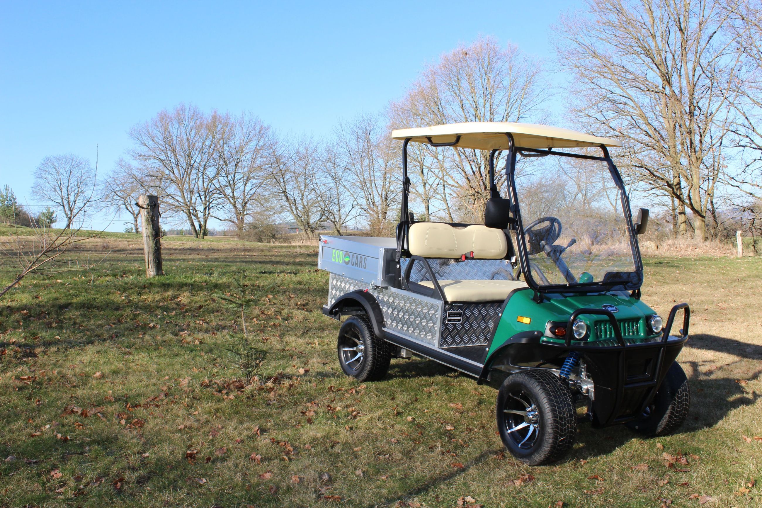 Evolution Truckster je dvoumístný elektromobil se zvýšeným podvozkem a praktickou korbou, navržený pro náročnou práci v terénu.