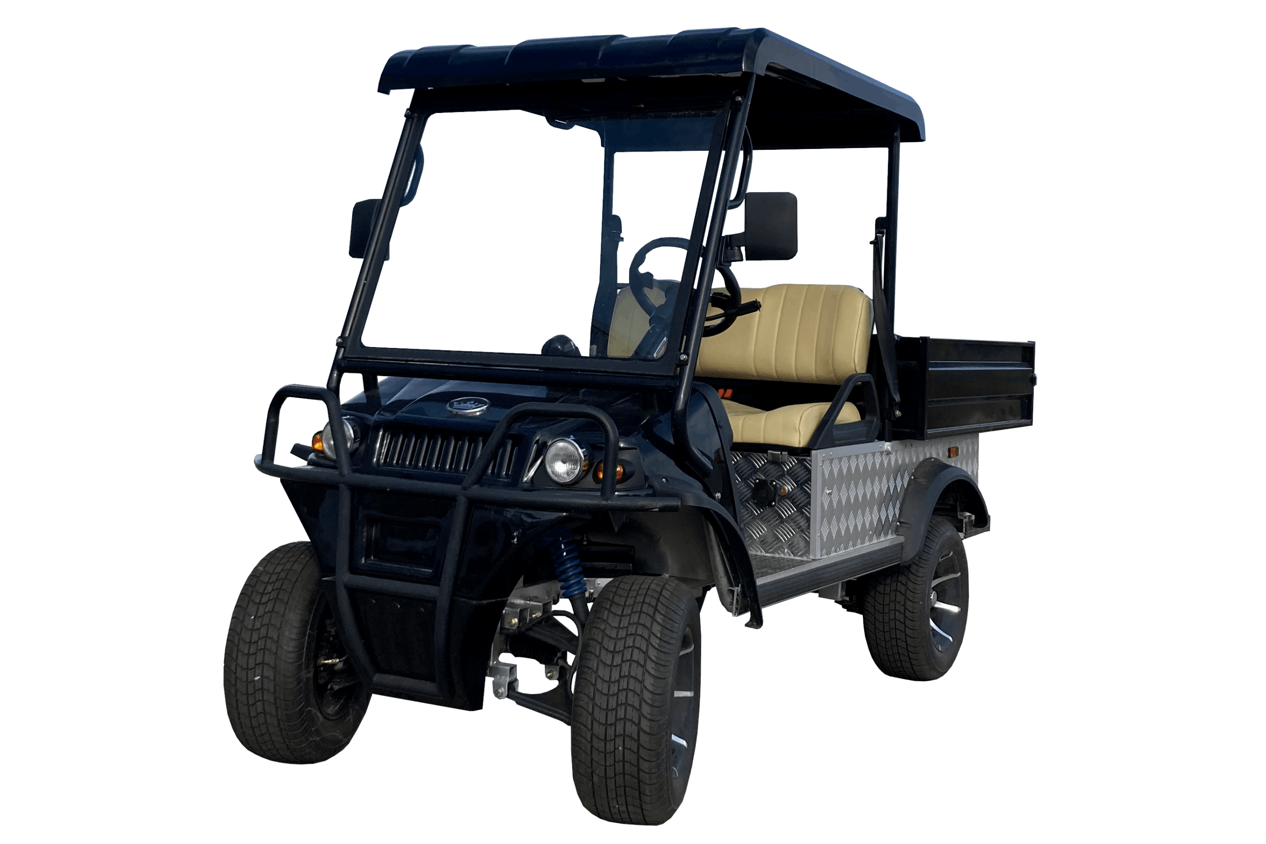 Evolution Truckster je dvoumístný elektromobil se zvýšeným podvozkem a praktickou korbou, navržený pro náročnou práci v terénu.